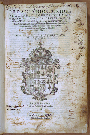Pedanius Dioscorides of Anazarbos, first century. Acerca de la Materia Medicinal, y de los Venenos Mortiferos, Traduzido ... por el Doctor Andres de Laguna ... (Salamanca, 1566). |