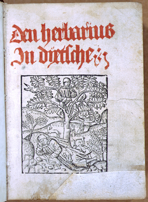 After Johann Gutenberg (1397?1468) created a press with movable characters to produce printed books, German printers soon added illustrations by means of wood blocks. In continuity with previous production, they began to produce herbals, books dealing with the therapeutic properties of plants, which also contained crude reproductions of the plants. Among the many volumes of this kind, there is the so-called Herbarius. While in Latin in its earlier versions, this popular text was soon translated into vernacular languages, German or Dutch, for example. This anonymous tract has been identified as the prototype for many of the subsequent herbals printed in the 15th and early 16th centuries. Shown here is a rare early-16th-century Dutch edition, the only copy currently known in America. |