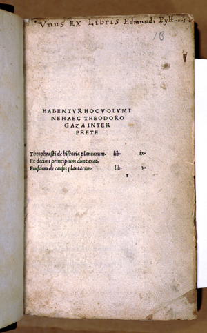 After the Fall of Constantinople (29 May 1453), Byzantine scholars and others emigrated to the West, particularly to Italy. Among them was Theodoros of Gaza (ca.1400ca.1475), who translated many Greek works, classical or Byzantine, into Latin. One of these translations revealed the treatise of Theophrastus to the West. A particular problem in this translation was the rendering of the technical terms: either Gaza did not know them or there was no exact Latin equivalent. In many cases, he simply transliterated the Greek term into the Latin alphabet without translating. According to Baudrier’s Bibliographie Lyonnaise (Lyons, 1895 and 1921), the edition shown here is a counterfeit of the edition published by Aldus in 1504.