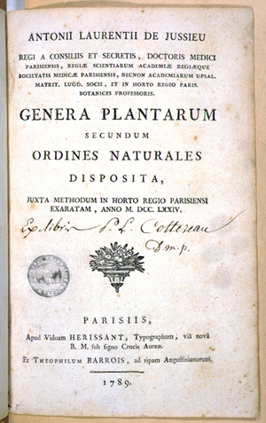 Antoine Laurent de Jussieu developed a natural system as early as 1774, incorporating a natural classification system along with Linnaeus’ binomial nomenclature. Jussieu evaluated and described an enormous number of plants new to Europe, brought back from voyages of exploration. His system was published in Genera Plantarum in 1789, the year of the French Revolution. Jussieu has been called one of the most intuitive and perceptive specialists in plant classification that the world has yet produced.