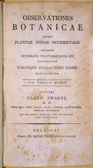A botanist and physician, Swartz studied under Linnaeus the younger. He traveled to the West Indies, North America, Jamaica, Puerto Rico, Haiti, and Cuba between 1783 and 1787. On his return he was appointed professor at a new school of gardening in Stockholm owned by the Royal Swedish Academy of Sciences and eventually was appointed to the academy’s highest position, secretary. Swartz is most famous for his taxonomic studies of groups of plants in the context of their worldwide distribution.