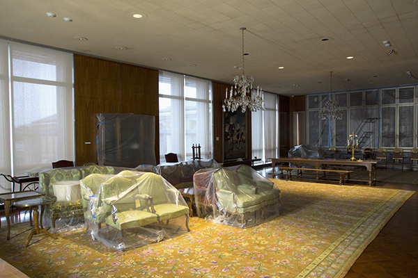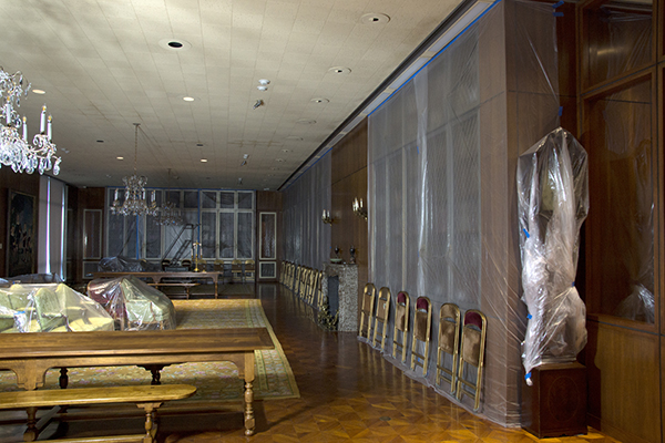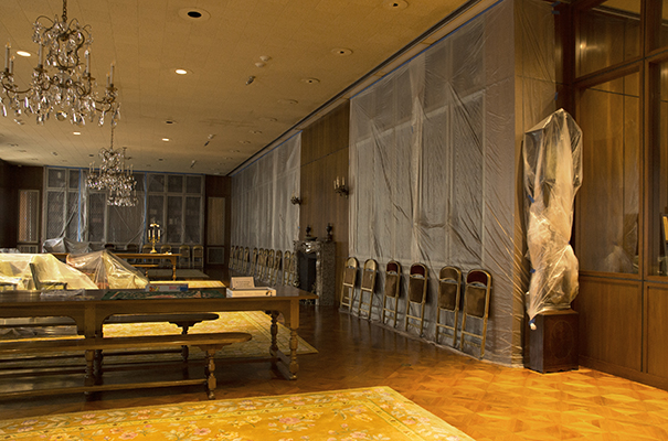 Like any well-preserved sofa from the 1960s, the Institute is now shrouded in plastic from the tall case clock to that sofa, the breakfront bookcase and beyond. In this series of photographs Graphics Manager Frank A. Reynolds takes us on a tour through our reading room and Library stacks where the books and the antique furniture have been covered in preparation for the upcoming HVAC system renovation.