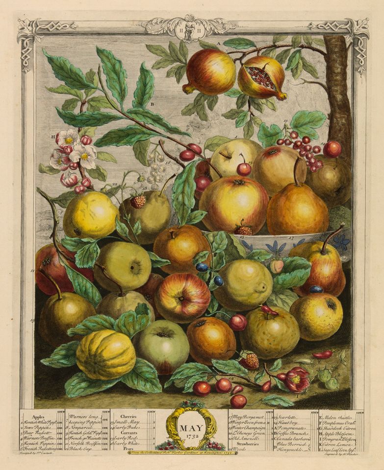 As we wait for the spring rains in Pittsburgh to abate so that we may venture into the garden, we turn to The Twelve Months of Fruits (1732) for inspiration. May offers varieties of apples, cherries, currants, pears and strawberries—any of which will be a lovely addition to a salad when the lettuce is ready. Its growth is vigilantly monitored by the garden bunny.