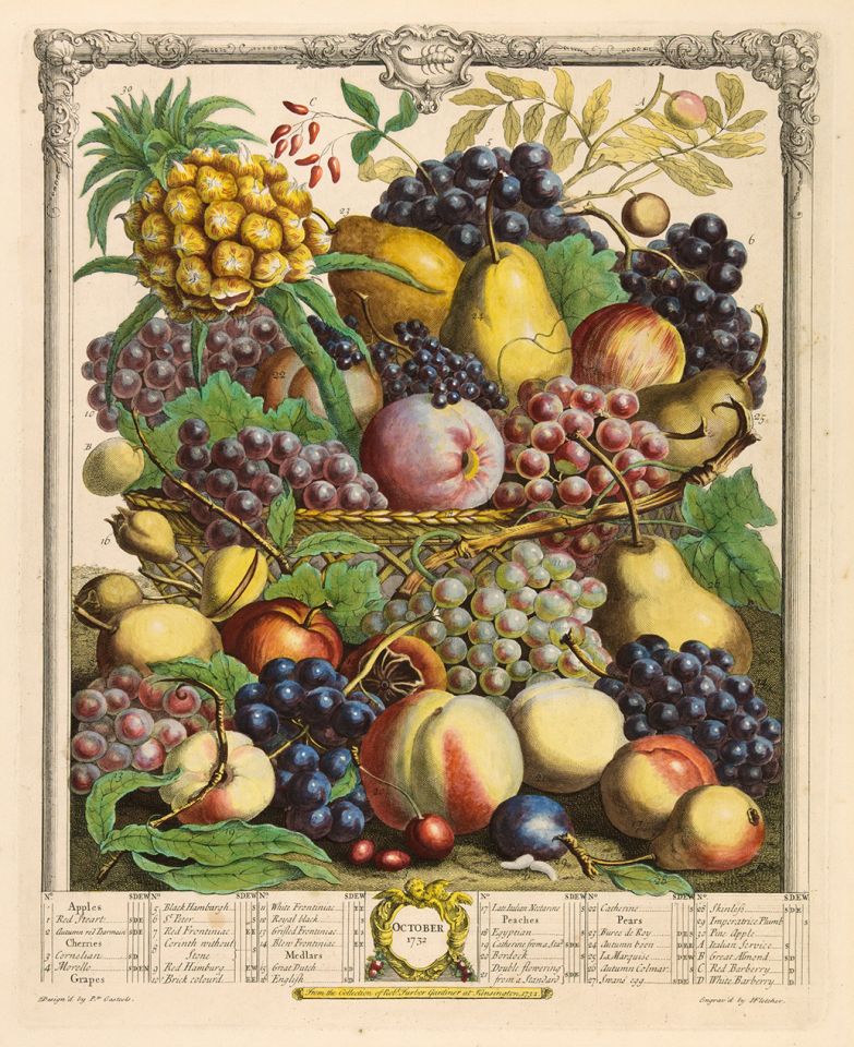 With the beautiful hills of western Pennsylvania awash in the many splendid colors of fall, we grab a freshly picked apple and savor the flavors of the changing season. The Twelve Months of Fruits (1732) celebrates the arrival of fall with luscious varieties of apples, cherries, grapes, medlars, peaches and pears.