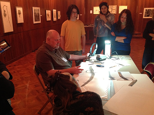 David Morrison, an Indiana artist whose colored pencil drawings are featured in our Elements exhibition, talked with Carnegie Mellon students from Adjunct Assistant Professor of Art Patricia Maurides' Art and Biology class and demonstrated his drawing technique.