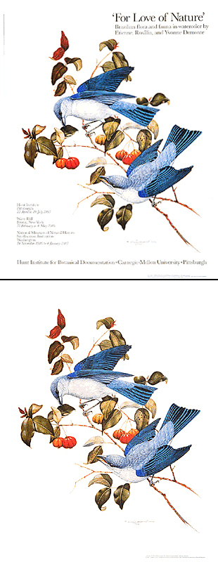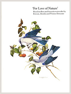 This bilingual catalogue accompanied a 1985 exhibition at the Institute and 1986 exhibitions at Wave Hill and the National Museum of Natural History. In the introduction Clarke Bruno described the Demontes within the context of the history of Brazil and its artistic traditions of representational painting and naturalistic drawing. The Demontes' slogan was "for love of nature." As Alcidio Mafra de Souza, director of the Natural Museum of Fine Arts in Rio de Janeiro, explained in the foreword, "Etienne, Rosália and Yvonne first study nature to know it; knowing it, loving nature, they demonstrate why it must be preserved and protected." Also accompanying the exhibition was Azure-shouldered tanagers (Thraupis cyanoptera) and Eugenia pitanga, a full-color reproduction of a painting by Etienne Demonte (1931–2004), 1984, 20 x 26", available with or without the exhibition title.
