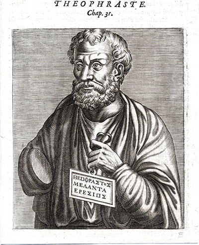 Theophrastus (ca.370–ca.286 B.C.), the "father of botany," engraving by an unknown engraver, 20.5 × 16.5 cm, after an engraving by an unknown engraver for Fulvio Orsini (1529–1600), Imagines et Elogia Virorum Illustrium et Eruditorum ex Antiquis Lapidibus et Nomismatibus Expressa: Cum Annotationibus (Rome, Lafréry, 1570, p. 59) after an original sculpture (now in the Villa Albani in Rome) by an unknown artist for André Thévet (1516–1590), Les Vrais Pourtraits et Vies des Hommes Illustres Grecz, Latins et Payens, Recueilliz de Leurs Tableaux, Livres, Médalles Antiques et Modernes (Paris, par la Vesve Kervert et Guillame Chaudière, 1584, vol. 1, p. 68), HI Archives portrait no. 5.