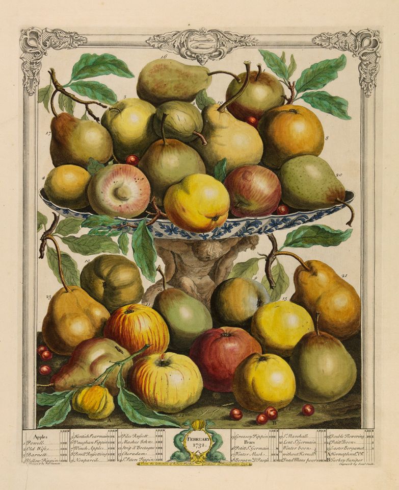 As the new year comes into sharp focus, we share another vision from The Twelve Months of Fruits (1732). We won't allow the pessimistic prognostications of Punxsutawney Phil to cast a pall over our ponderings of an early spring. We are eager to start gardening, and February offers more varieties of apples and pears to inspire our selection.